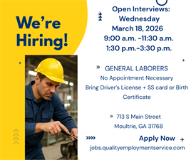 Open Interviews for General Laborer positions. No appointment necessary. Bring 2 forms of ID (ex. Driver's license + SS card or Birth Certificate).